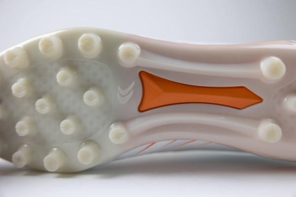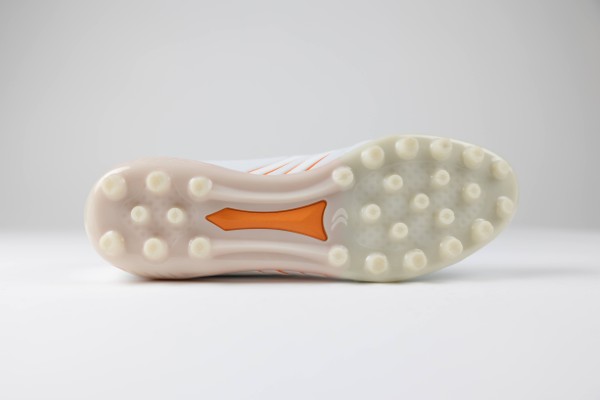 機能面では「足への優しさ」を追求。クッション性に優れたミッドソールを内蔵し、高さを低めにした27本マルチスタッドが硬いピッチからの突き上げを軽減、足裏や膝への負担を和らげます。